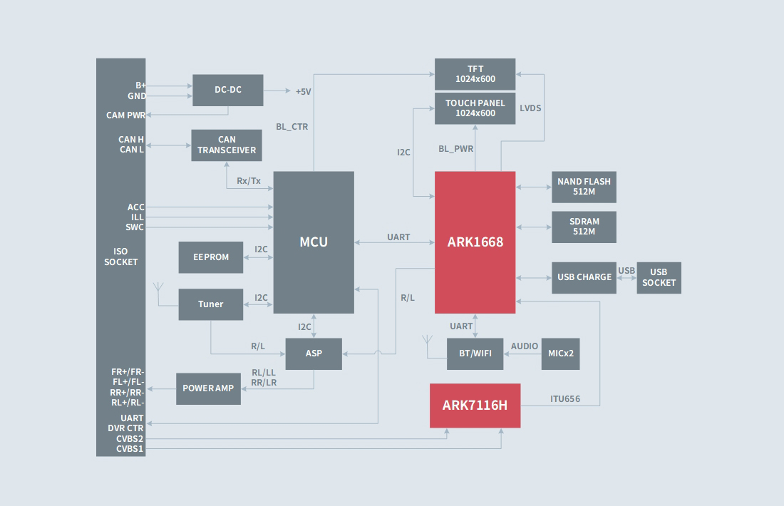 本方案是ARK711H6在車載信息系統中的倒車顯示上的應用。